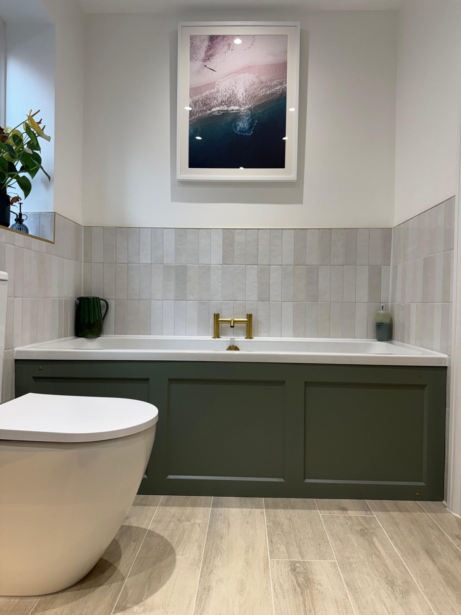 The bathroom features a bespoke walk-in shower enclosure, complemented by a wall-to-wall niche with integrated LED lighting for both style and practicality. Brushed brass fittings add warmth and elegance, while Ca’ Pierre floor tiles paired with matte-finished walls and ceiling create a cohesive, refined finish.
