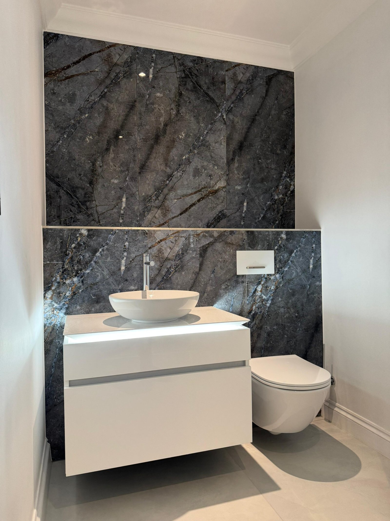 The space features striking contrast tiling that creates strong visual impact, paired with a wall-hung toilet finished with a sleek glass flush plate. LED underlighting enhances the floating vanity effect, while a countertop basin with a polished chrome tap completes the clean, contemporary design.